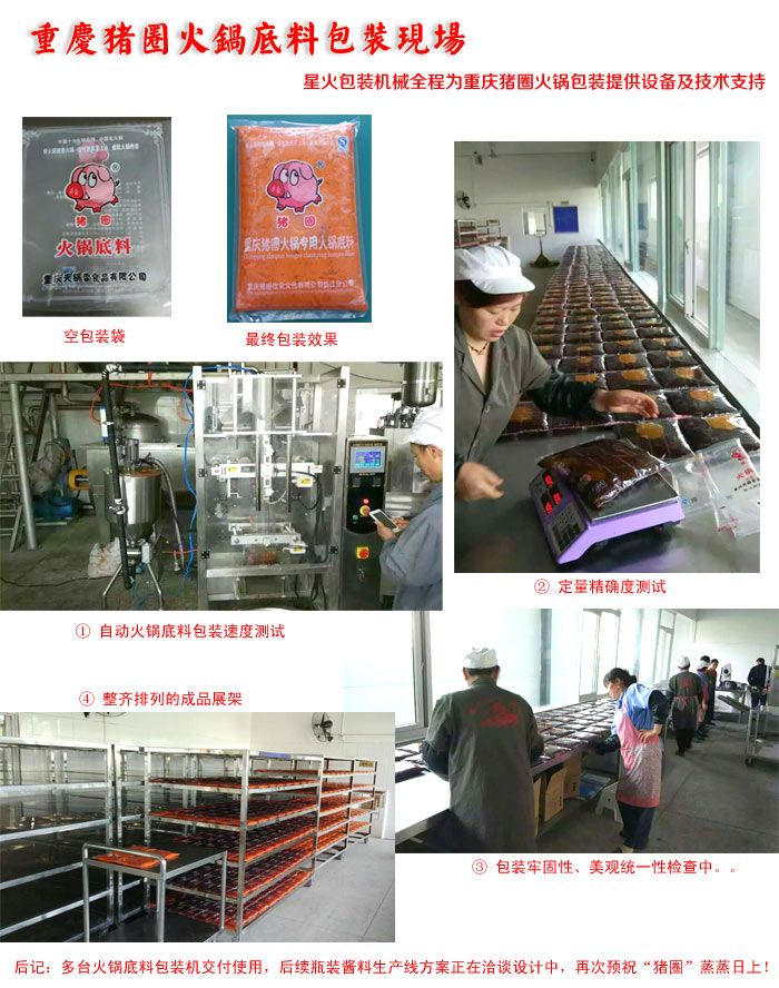 重慶豬圈火鍋是重慶豬圈飲食文化有限公司創(chuàng)立的火鍋連鎖品牌,公司成立于2003年,公司集火鍋底料開發(fā)、研制、外加工等綜合性實體公司。本公司旗下有“豬圈火鍋”(重慶老火鍋)、“天鍋香火鍋”(重慶新派火鍋)、“御豬豬圈火鍋”三大品牌,均獲得國家商標(biāo)注冊,公司3家直營店均分布在重慶主城區(qū),分布在全國各地的加盟店100余家,自建食品廠一個,占地13000平方米,總投資3500萬,通過國家QS認(rèn)證。公司火鍋底料生產(chǎn)部為了滿足生產(chǎn)需求,再全國招募火鍋底料包裝機(jī)械生產(chǎn)企業(yè),經(jīng)過層層篩選,最終和我公司達(dá)成戰(zhàn)略合作伙伴關(guān)系,由我公司負(fù)責(zé)該公司火鍋底料、醬料系列產(chǎn)品灌裝全套設(shè)備。